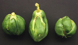 This fruit deformity that makes the fruit look like a cat’s face (Figure 9) occurs on hermaphrodite plants of some genotypes when the plants are exposed to low night temperatures and high moisture and nitrogen levels. Under such conditions, the stamens become joined with the ovary and develop into carpel-like structures. This deformity makes the fruit unmarketable. To avoid this problem, do not use seeds from the affected tree to produce seedlings.