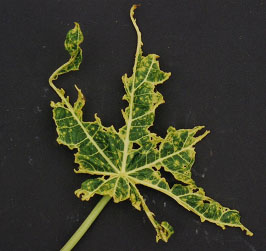 This viral disease is caused by the papaya ringspot virus –P strain. It is transmitted by the insect vectors belonging to the Aphididae, namely Myzus persicae and Aphis gossypii. It can also be transmitted through contaminated pruning or harvesting knives. This disease was found in Johore a few years ago and infected many papaya plantations. It was first reported in Hawaii and then in Florida, the Caribbean countries and Australia. It is present in a few Asian countries, including Thailand, Vietnam, the Philppines, India and Taiwan. Sarawak is still free from this disease.