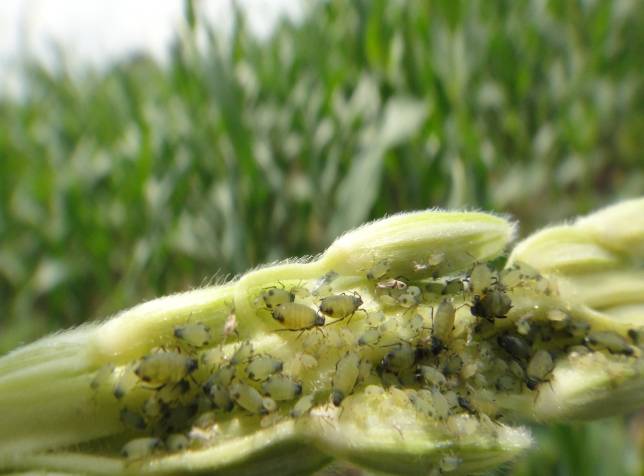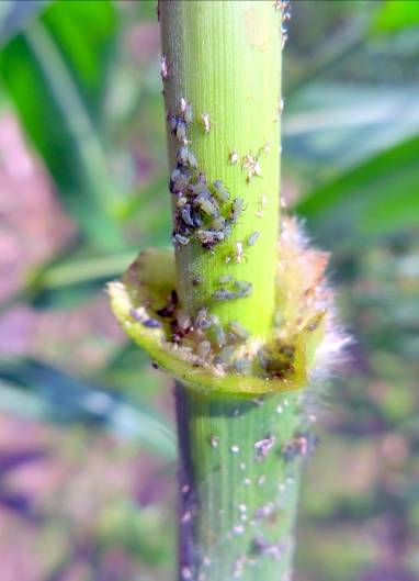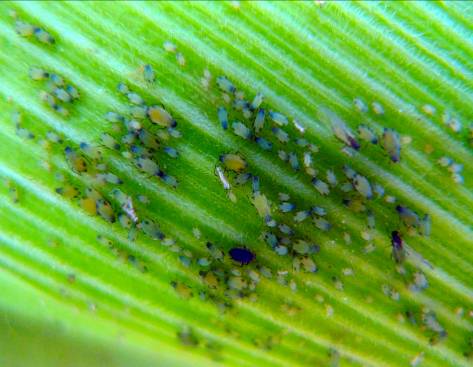The corn plant is often infested by corn leaf aphids. Corn leaf aphid is about 0.9 mm to 2.4 mm long, elongated in shape with a pair of short antennae. . It is yellow green to dark olive green. It has sucking mouthparts and feeds by inserting the stylets into the corn tissue. There are two forms: wing or wingless. These aphids are very unique. When their populations increase, the females will develop wings and fly to less crowded sites to begin their new colonies. The aphid population is primarily females that reproduce asexually, i.e. without mating. Therefore, they can be found in big numbers.