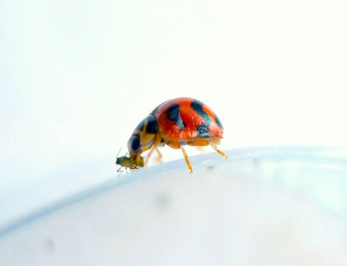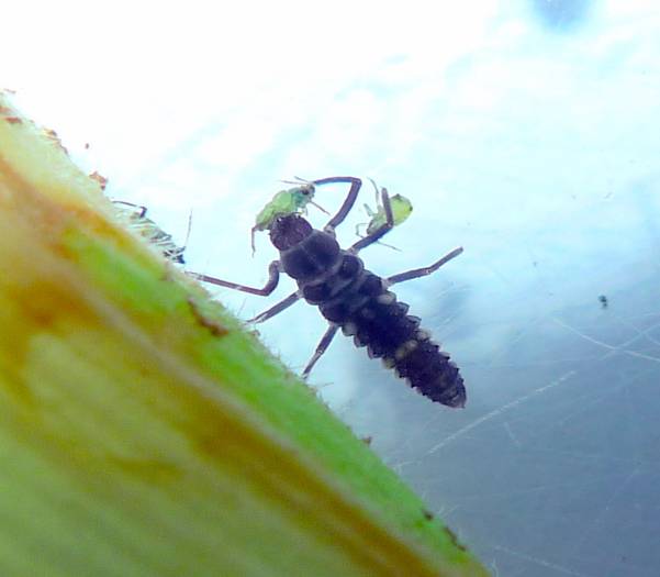 Corn leaf aphids are subjected to control by different types of natural enemies, including parasitic wasps and predators such as ladybird beetles and lacewings. Predatory ladybirds are widely considered as important biological control agents. The ladybird beetle, Menochilus sexmaculatus has been reported as the most common species of predators. Both larva and adult stages actively search for aphids to prey on. The larva locates its prey by contact while the adult uses its smell and visual cues to detect their prey.