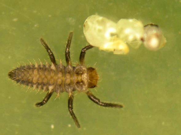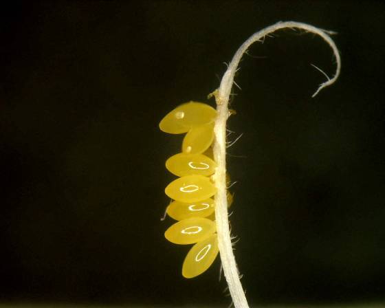 The ladybird beetle passes through four developmental stages: egg, larva, pupa and adult. The eggs are laid in clusters where there is abundance of aphids. Freshly laid eggs are cigar in shape and yellow in colour, and usually in a cluster of 20 to 30 eggs. They turn blackish as they mature and become completely dark before hatching.