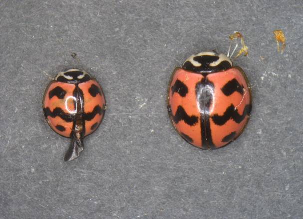 Once the eggs hatch, the larvae will come out and start looking for something to eat. The larva looks completely different from the adult and they undergo four instar stages before it pupate. At the time of pupation, it assumes a curved shape and attaches itself to the leaf surface. The adult has a body length of 3.3 mm to 6.2 mm, orange or light red colour with two zig-zag lines and a posterior black spot. The female can be differentiated from the male at the pupa stage or the adult stage by its size. The female is slightly bigger than the male.