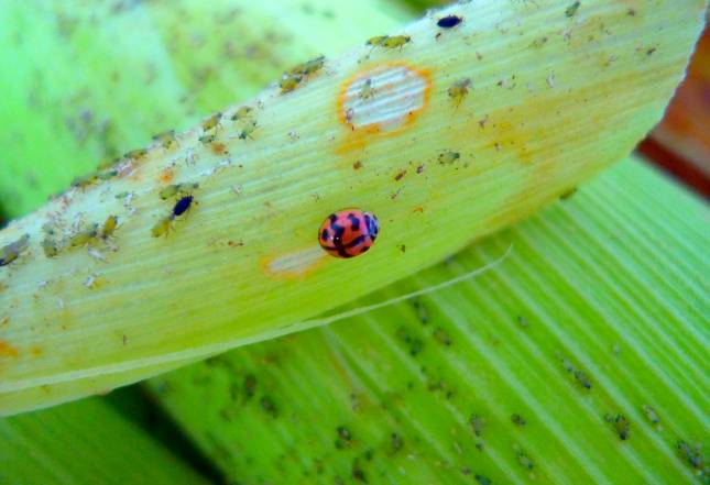 The ladybird beetles are found naturally in the environment where the corn leaf aphids exist. Since the corn leaf aphids seldom occur in damaging densities, it is encouraged to depend on this biological control agent, the predatory ladybird beetle, to regulate the aphid population and thus reduce the need for costly and environmentally damaging insecticide application.
